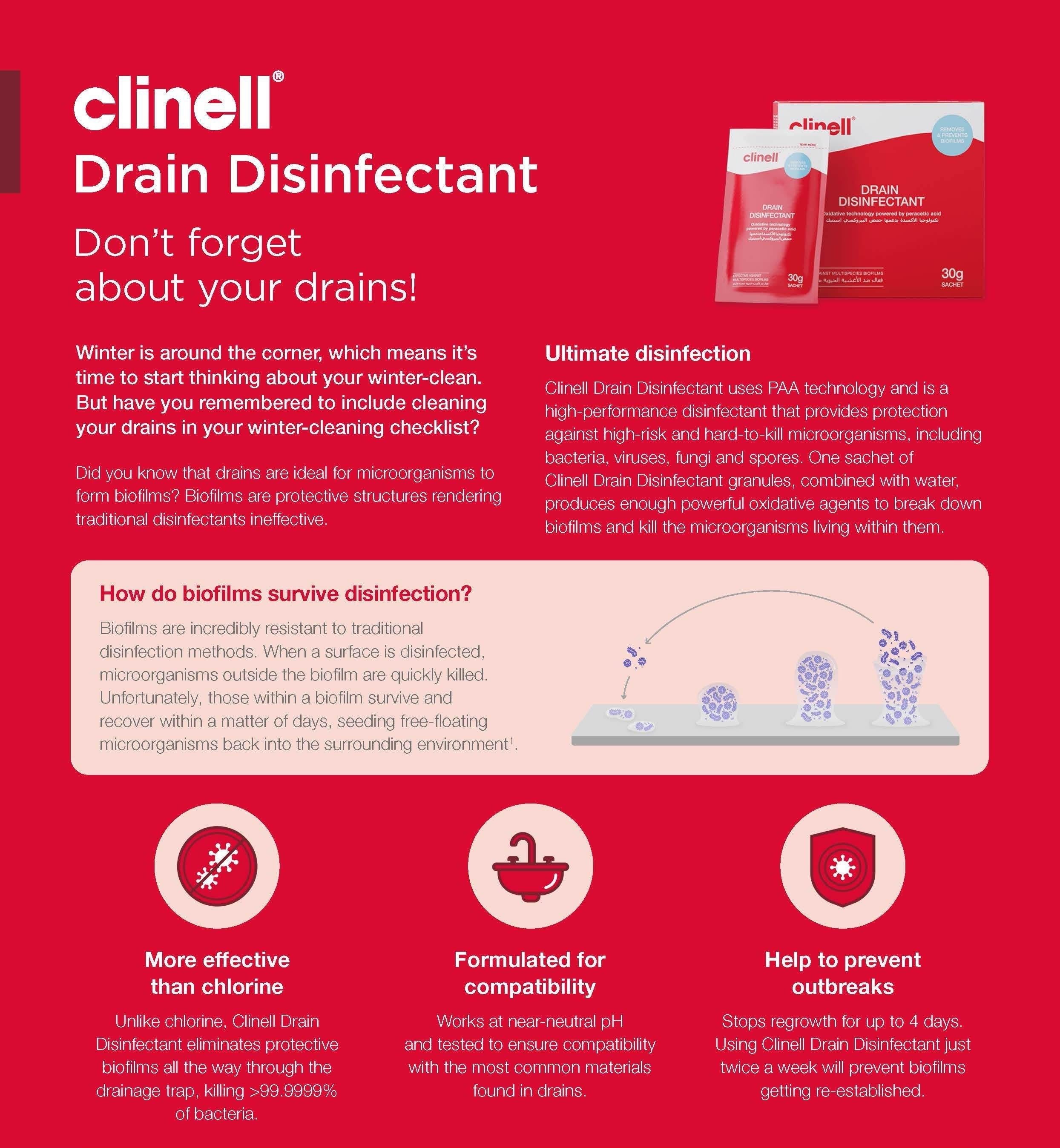 Prevents regrowth for up to 4 days. Using Clinell Drain Sanitizer twice weekly will stop bacterial biofilms from re-forming for up to 4 days.