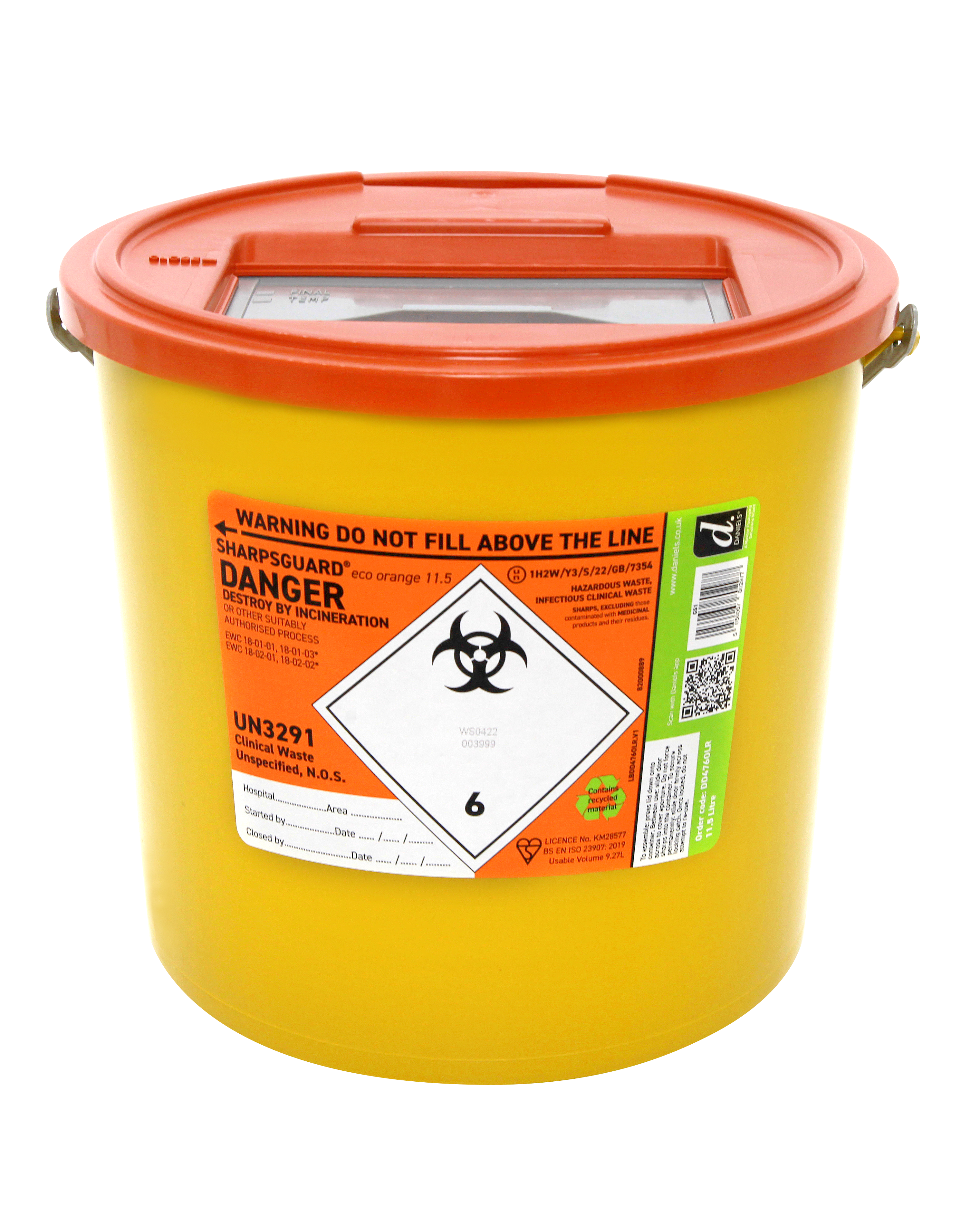 This versatile container is equipped with a sturdy pail handle, ensuring effortless transport even when filled. The SHARPSGUARD® orange 11.5 boasts a broader opening, facilitating the insertion of larger objects with ease.