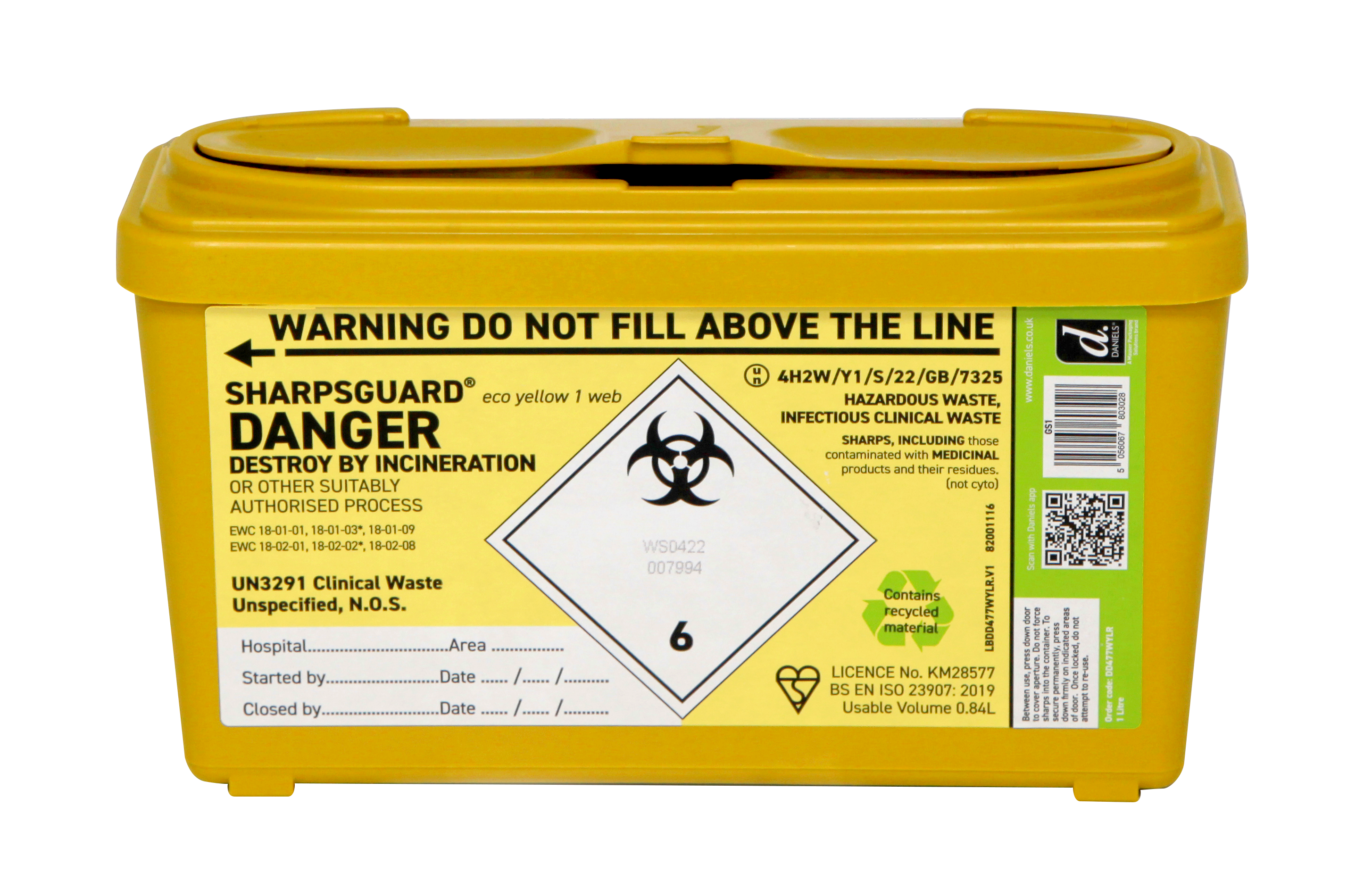 This container is intended for disposal through incineration or other approved methods and is suitable for waste classified under EWC codes: 18-01-01, 18-01-03, 18-01-09, 18-02-01, 18-02-02, 18-02-08.