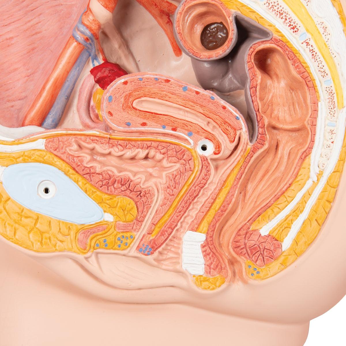 This model of the female pelvis is presented in a median section. It features one side of the female reproductive organs, including the bladder, with a detachable rectum. The pelvis is mounted on a baseboard, allowing for convenient wall installation in educational or medical settings.