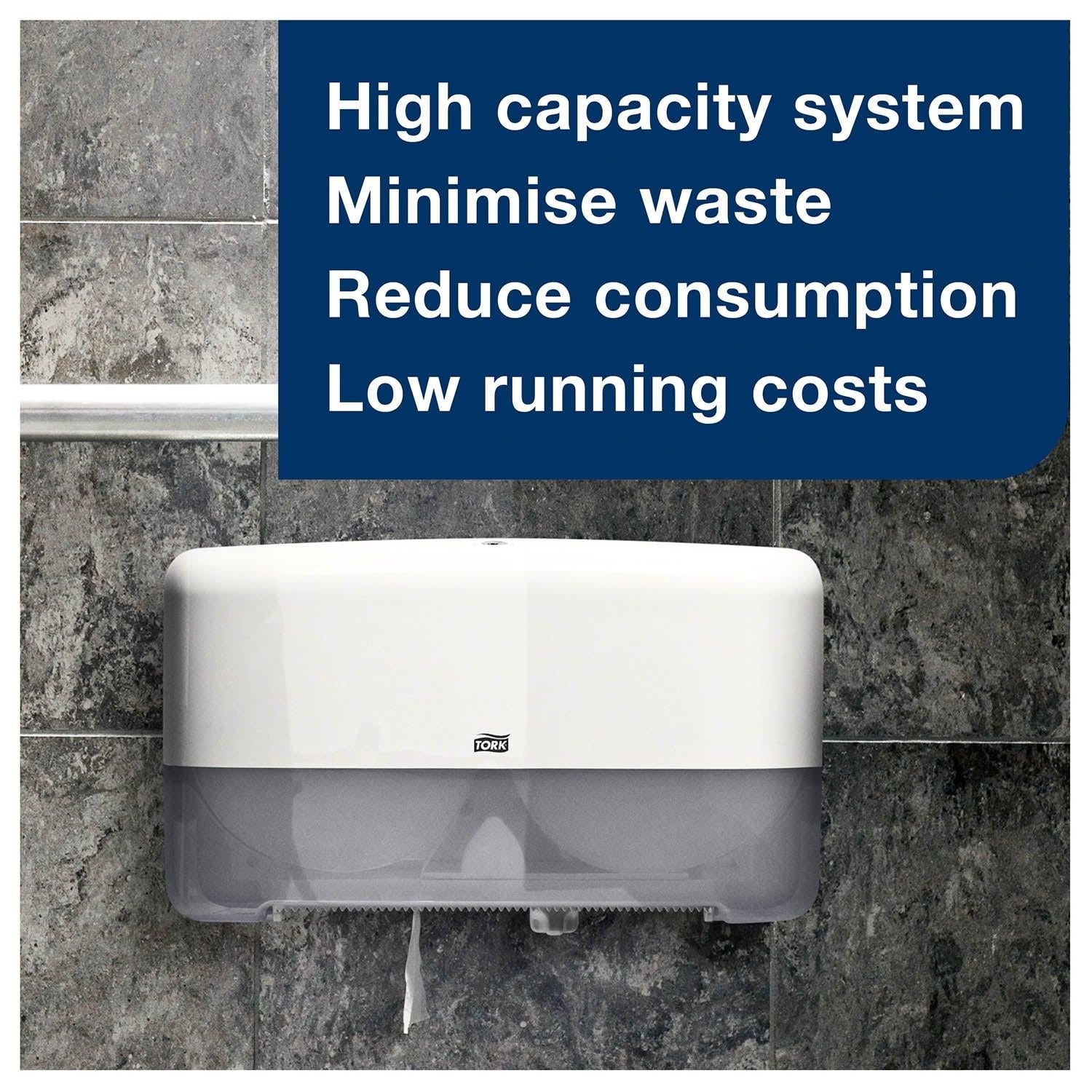 The Tork Mini Jumbo system is designed for efficiency and cost reduction, providing significantly more toilet paper than traditional rolls. Tork Mini Jumbo Toilet Rolls Premium 2-ply deliver an exceptional appearance, feel, and performance, ideal for medium to high-traffic areas.
