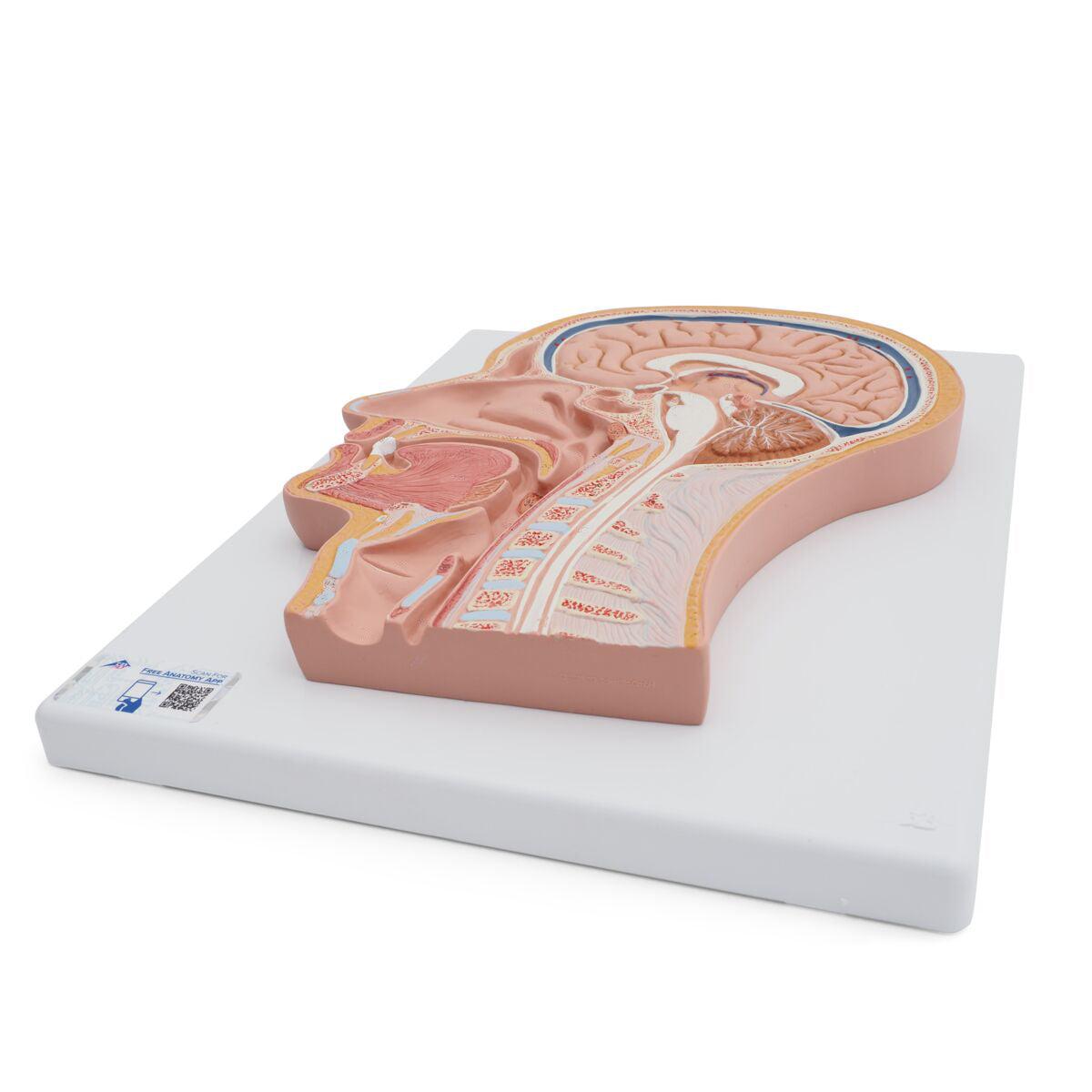 This detailed relief model intricately displays all significant structures of the human head. The median section serves as an excellent educational tool for illustrating key anatomical features. This premium model is mounted on a baseboard, making it ideal for showcasing in educational or medical settings.