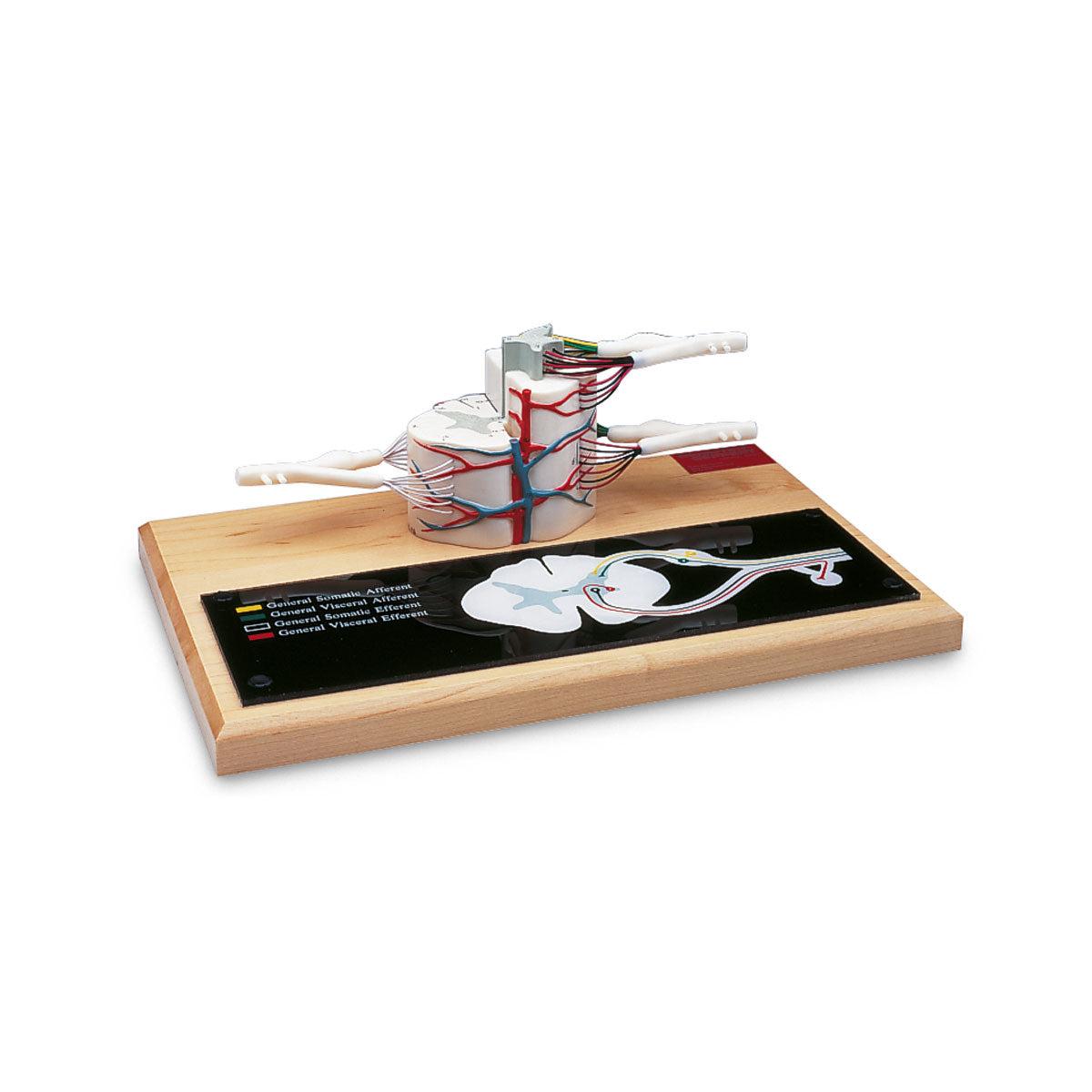 This model of the spinal cord represents a section of the upper thoracic region, featuring both lateral and longitudinal divisions that display the spinal nerve roots.