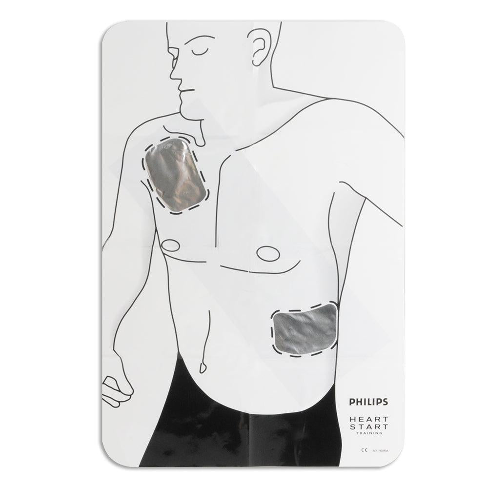 Philips Healthcare's Guide for Adult Electrode Pad Positioning. This "roadmap" illustrates the correct placement of electrode pads on a patient, designed for educational use. It ensures the training electrode pads operate effectively during practice scenarios. Size: 16" x 23.5".