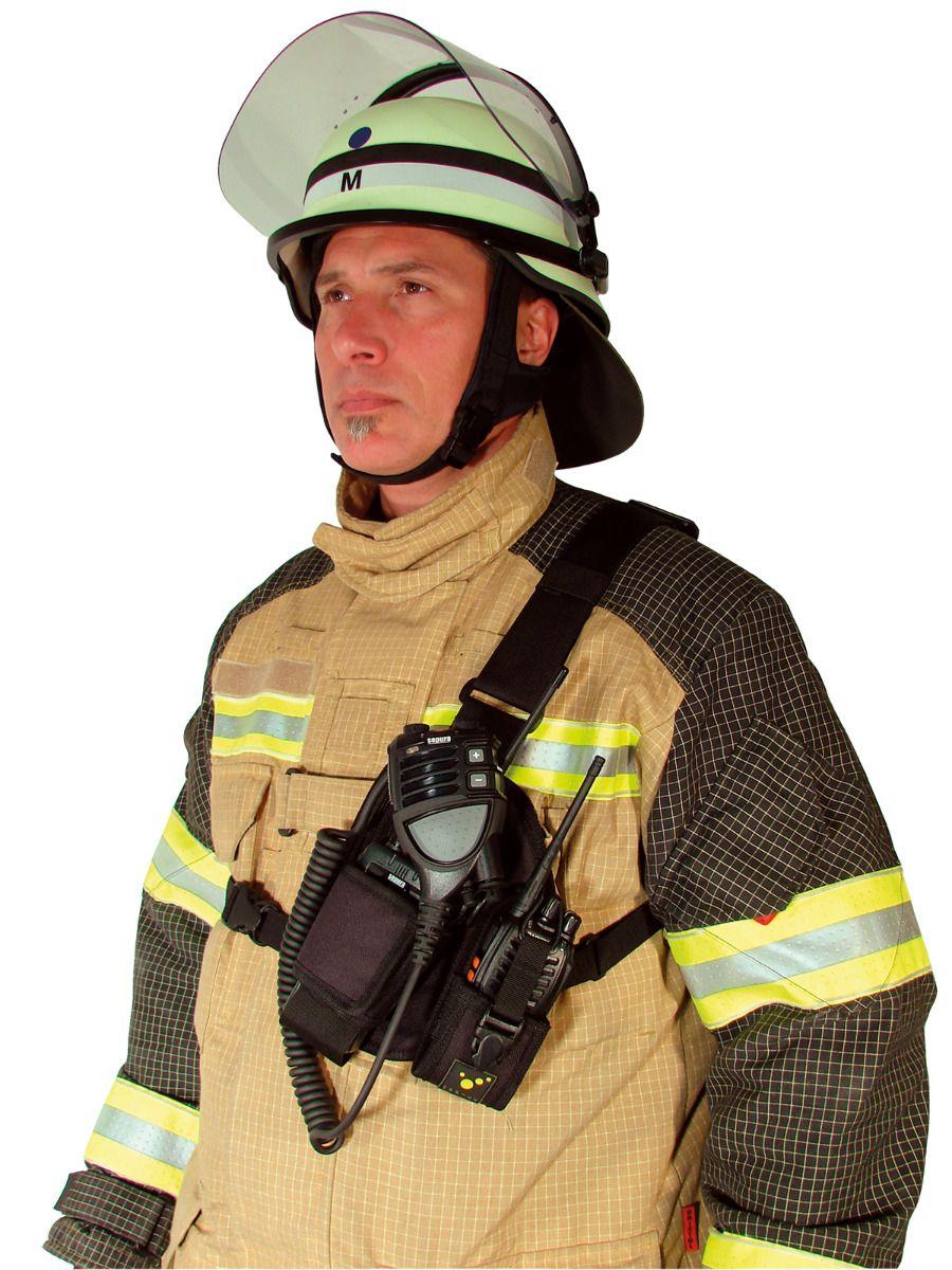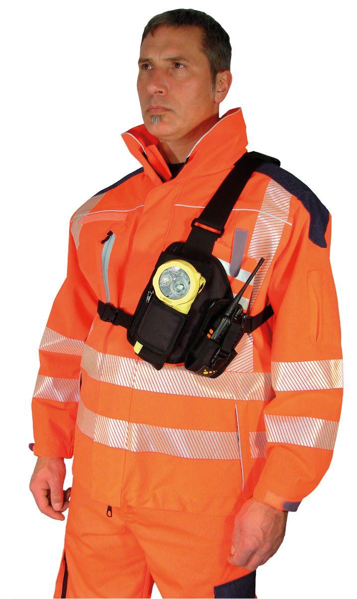 The CHEST Radio-harness in its standard setup includes a customizable device pocket and a zippered document holder.