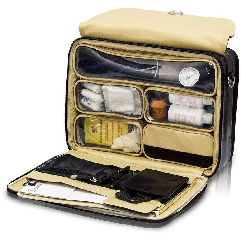 This sophisticated leather medical bag offers a practical interior design, ensuring efficient organization of all essentials required for any medical home visit.