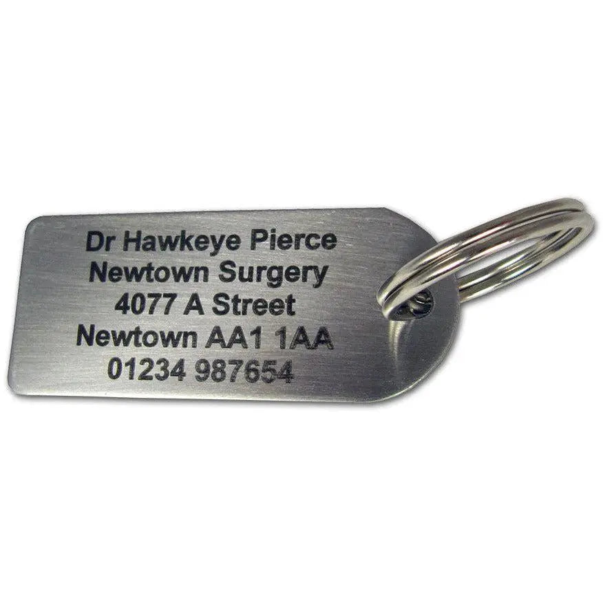 Engraving is applied to a metal tag with a keyring that can be attached to your bag.