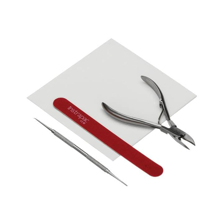 Disposable Podiatry Assistant Instrument Set featuring a top-quality 13cm nail clipper, designed with a curved head and a smooth-action roller spring to minimize user fatigue. Crafted from premium medical-grade surgical stainless steel. Packaged in an easy-to-open, sterile package. The contents are enclosed within a sterile environment.