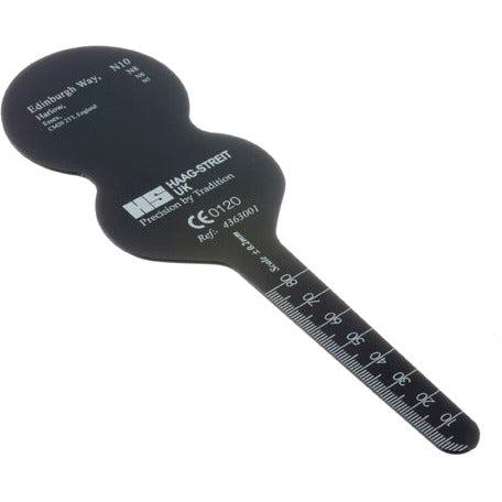 The Romanes Occluder serves as an essential tool for the trial case, aiding in visual acuity evaluation and the cover test. One side of the handle features a millimeter scale for measuring inter-pupillary distance and quantifying ptosis. The opposite side includes a white dot, designed for use as a scotometry target or fixation point.