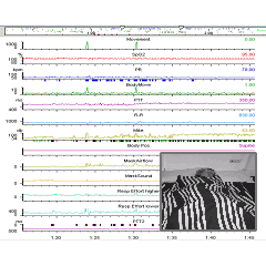 Visi integrates these signals with ECG (EKG) to derive additional sleep disturbance metrics: ECG waveform and R-R interval, Pulse Transit Time, and the Pulsatile Index (variability in the plethysmograph signal size following arousal).