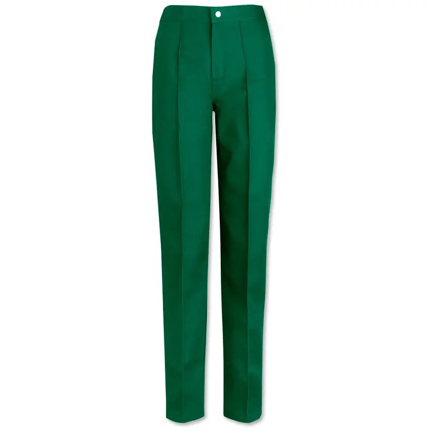 These women's flat front trousers are designed with permanent creases for a polished appearance, ideal for any professional setting. They include an elastic waistband for enhanced comfort and a zip closure with a hook and bar. Available in multiple colors.